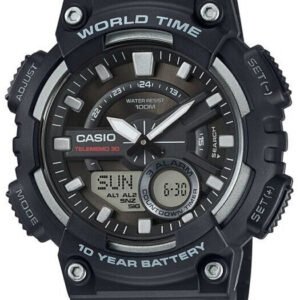 The Casio AEQ-110W-1AVEF men’s watch is an excellent choice for men with active lifestyles who are looking for a reliable and functional timepiece. Its sporty character, combined with a modern design, makes it an ideal watch for both everyday use and intense physical activities. The watch’s envelope, made of high-quality plastic, is resistant to damage, and the mineral glass effectively protects the dial from scratches. The black dial with an easy-to-read digital display ensures that the time is easy to read, and the large rubber strap in black guarantees comfortable wear, even during prolonged use. The watch offers a wide range of functions, such as world time, stopwatch, timer, 3 daily alarms, as well as the ability to store 30 phone numbers in memory. Thanks to the Neobrite function, the watch allows you to comfortably read the time even in the dark. Water resistance up to 100 meters allows you to swim freely without worrying about damaging the watch, and its solid construction makes it reliable in all conditions. The Casio AEQ-110W-1AVEF is a watch that combines reliability, functionality and style, being an ideal choice for men who value convenience and precision.