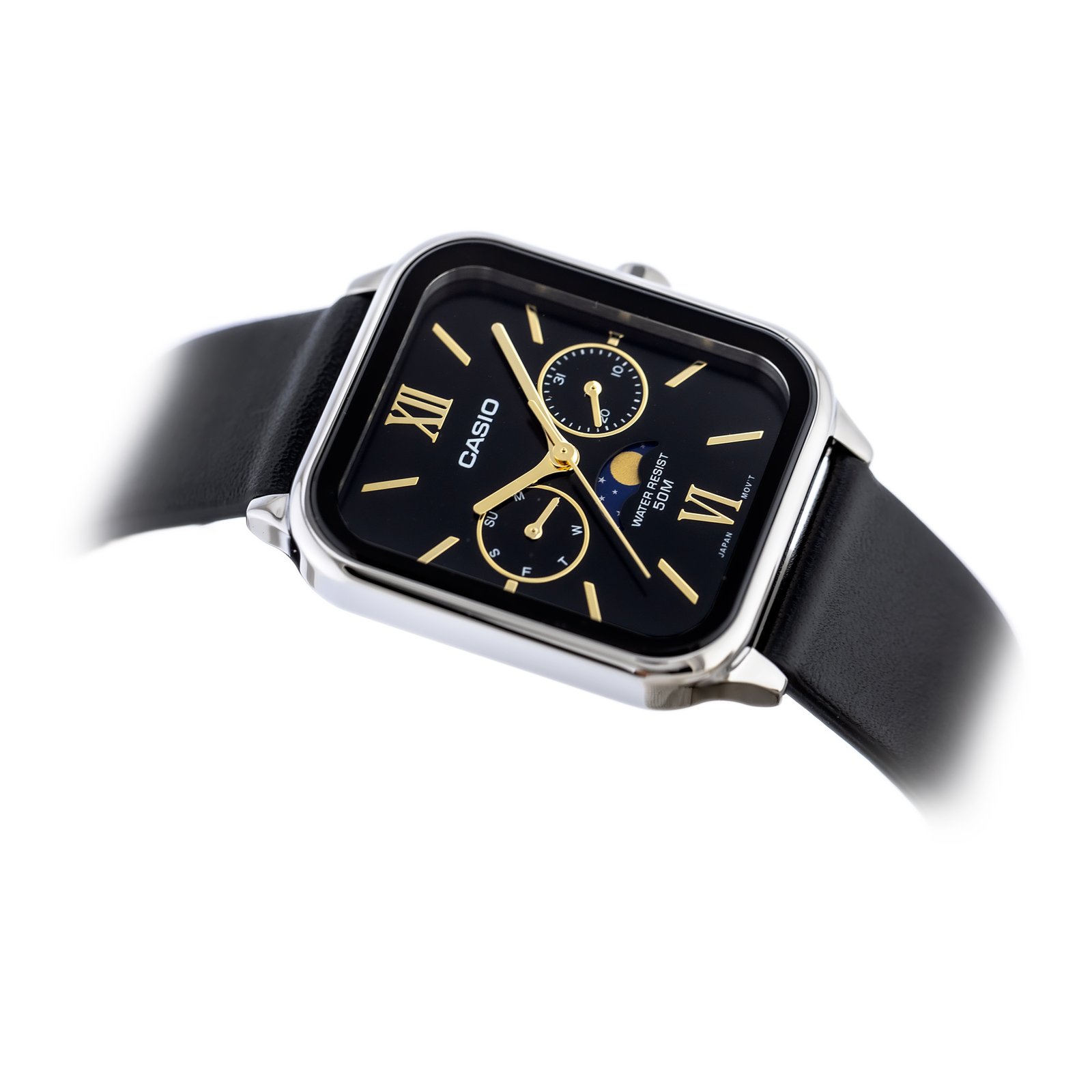 The watch case is made of stainless steel, which guarantees durability and resistance to mechanical damage. The black dial with date and moon phases adds subtle elegance to the watch. The classic black leather strap ensures comfortable wear and adjustment to different wrist sizes.