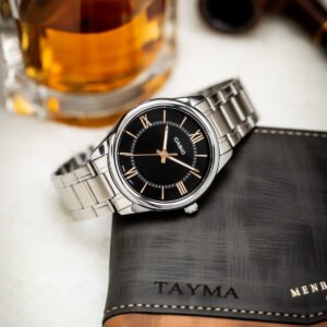 The black-colored dial subtly contrasts with the gold-colored hands, providing not only an elegant look, but also excellent legibility. Combined with a solid silver-colored steel bracelet, the watch takes on a distinctive masculine flair that will work well both at work and during weekend get-togethers with friends.