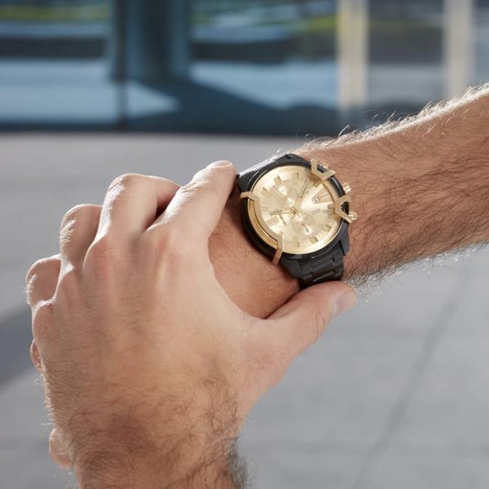 The Diesel Griffed DZ4525 watch is a choice for men who appreciate distinctive black and gold accents. Its elegant design includes a round envelope and bracelet made of corrosion-resistant stainless steel, as well as an analog dial protected by mineral glass. On the dial, you’ll find a date display and sub dials for the chronograph. The crown and complication buttons are located on the left side of the envelope. With a water resistance rating of 50 meters, the watch is splash-proof to protect the quartz mechanism.