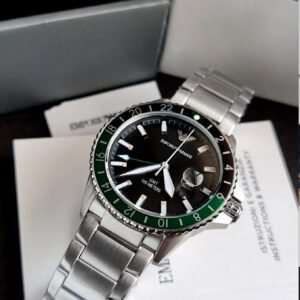 The Emporio Armani AR11598 – Diver GMT watch is a stylish men’s timepiece, ideal for both elegant attire and casual wear. On the tasteful black dial protected by scratch-resistant mineral glass, you will find a date display indicating the day of the month.