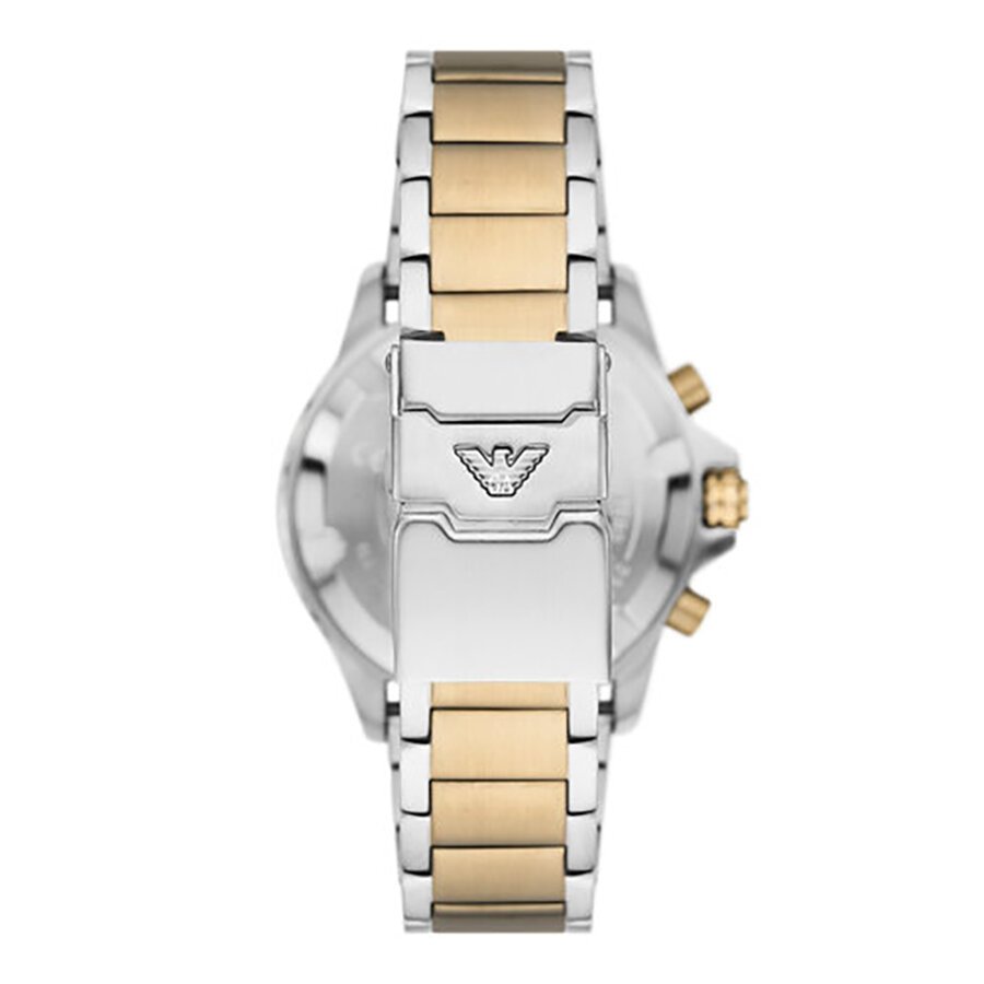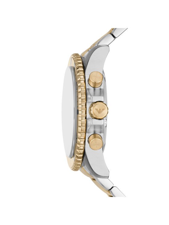Men’s Emporio Armani AR11606 Two-Tone Chronograph is a stylish men’s watch, ideal for both elegant attire and casual wear. The bracelet and the envelope are made of stainless steel. The gold dial protected by mineral glass features a date display indicating the day of the month, as well as chronograph and daylight saving time indications. The Emporio Armani AR11606 Two-Tone Chronograph watch will suit every man’s taste and will be a perfect gift for any occasion. The water resistance class of the timepiece is WR100, which guarantees that the watch is waterproof, for example, when swimming.