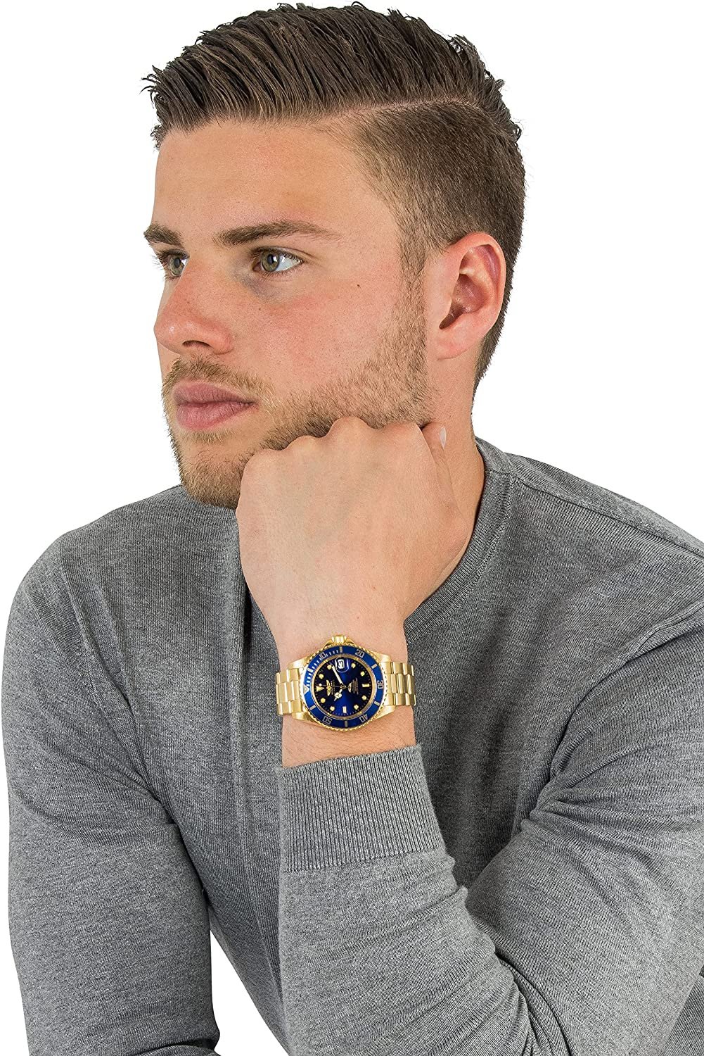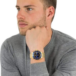 Na granatowej tarczy zabezpieczonej szkłem wykonanym w technologii Invicta Flame Fusion znajduje się datownik wskazujący dni miesiąca z lupą oraz wskazówki i indeksy pokryte luminescencyjna warstwą Tritnite. Stalową bransoletę oraz kopertę z powłoką w kolorze złotym uzupełnia granatowy pierścień.