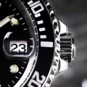The black dial features a date display indicating the days of the month with a magnifying glass, as well as hands and indexes coated with luminescent Tritnite