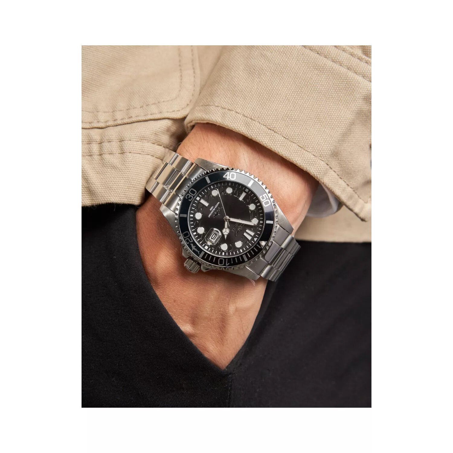 INVICTA Pro Diver 30018 watch is a classic diver with water resistance up to 100m, with a quartz SEIKO PC32A movement. The black dial features a date display indicating the days of the month with a magnifying glass and fluorescent hands. The envelope and bracelet are made of stainless steel, which guarantees many years of resistance to damage.