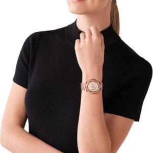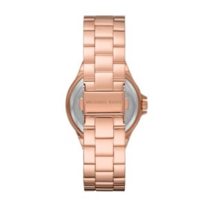 Zegarek Michael Kors MK7230 Lennox to bardzo efektowny i kobiecy dodatek zarówno do sportowych jak i casualowych stylizacji. Tarcza zdobiona cyrkoniami z dużym logo MK – całość zachowana w kolorystyce różowego złota. Koperta i bransoleta wykonana ze stali szlachetnej w tym samym kolorze. Zastosowane szkło mineralne, które gwarantuję ochronę przed pęknięciami. Zegarek posiada szczelność na poziomie 50 m co oznacza, że jest odporny na niewielkie zachlapanie.