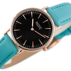 Color scheme: strap in turquoise, envelope and index in rosegold, dial in black