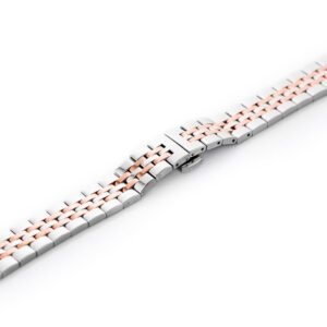 Steel bracelet with butterfly clasp for high quality watch in silver and pink gold color.