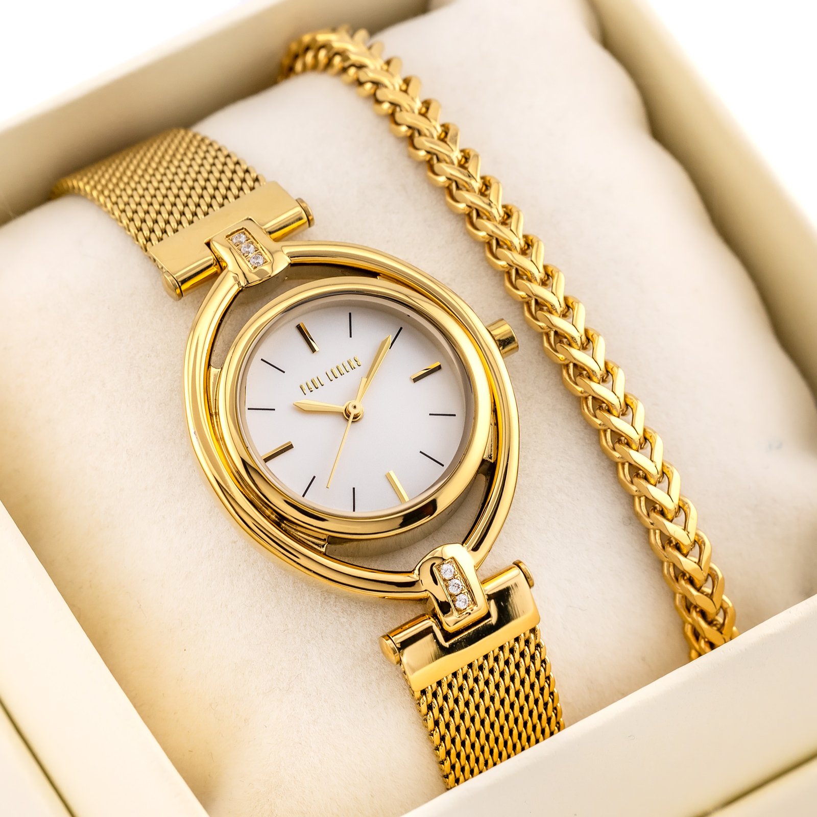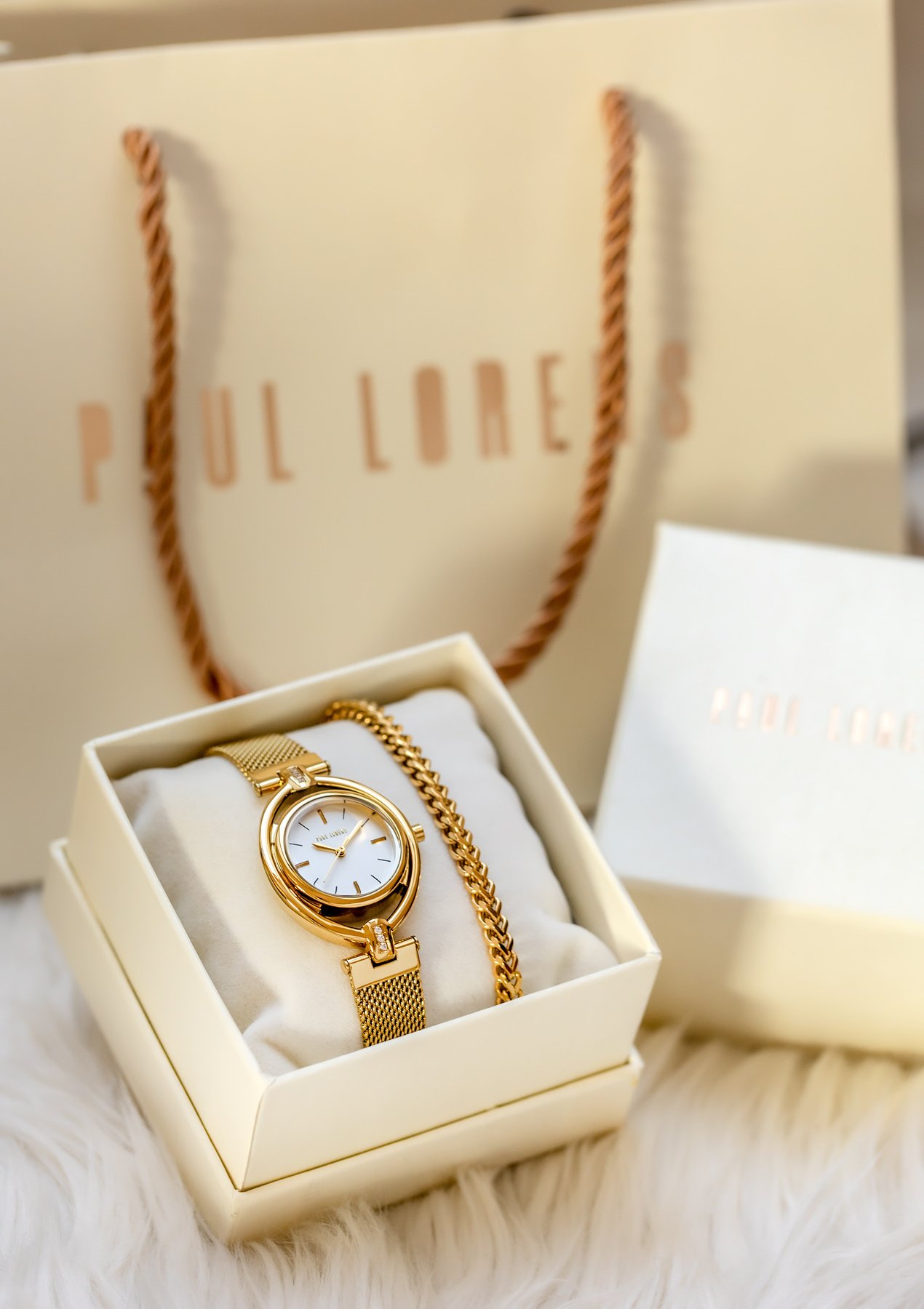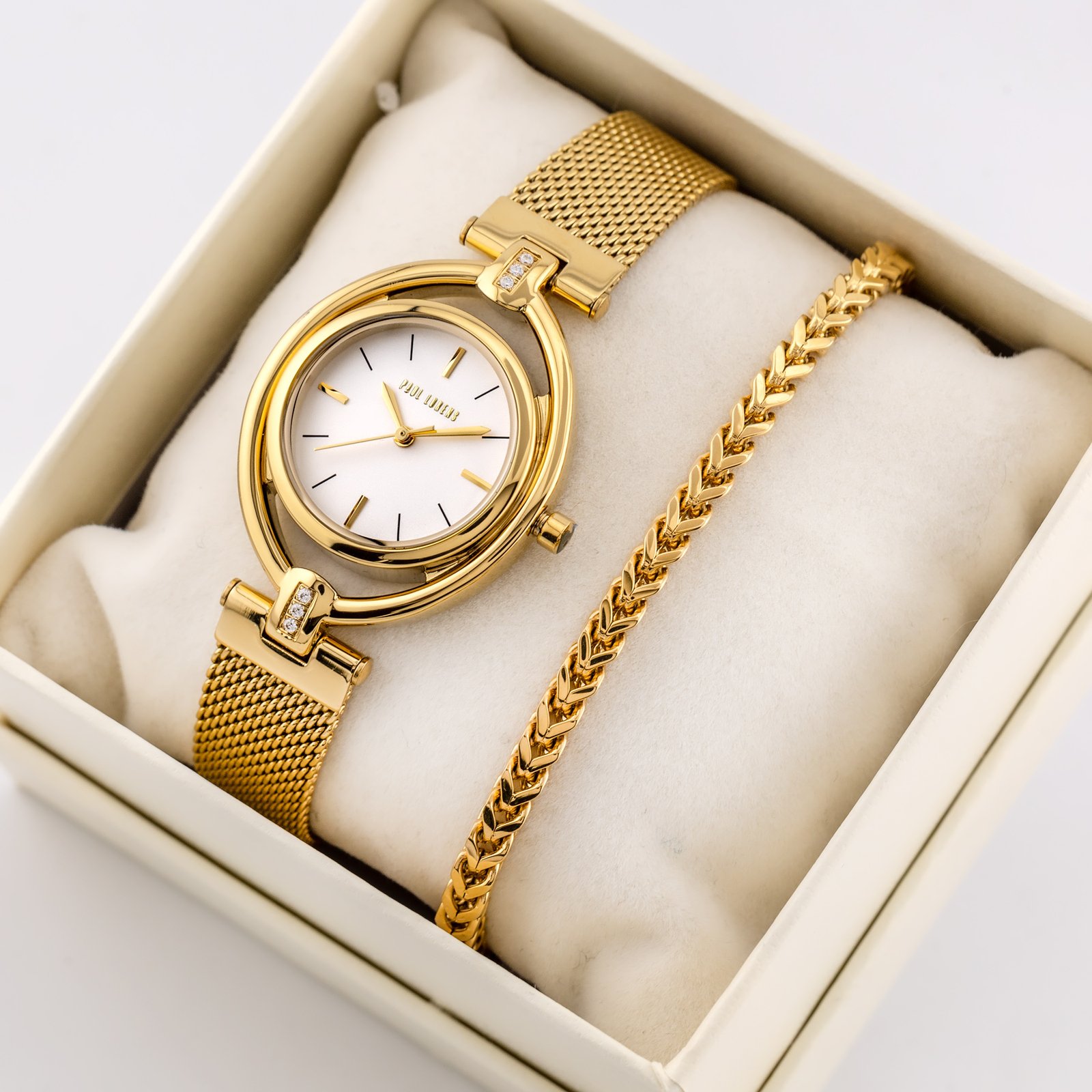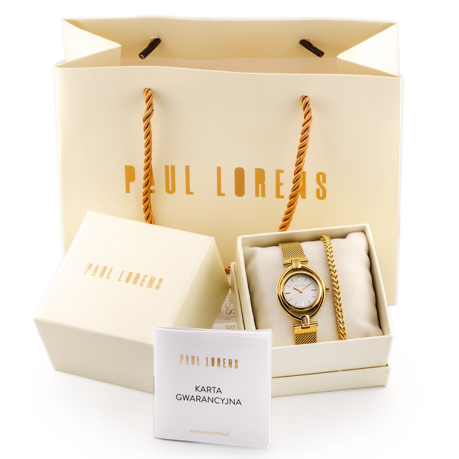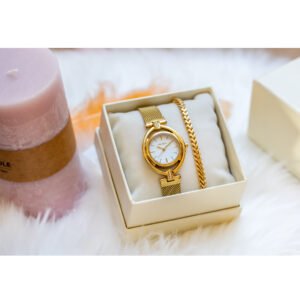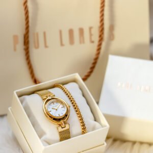 A women’s gift set that impresses with its elegance and timeless style. It includes a gold-colored stainless steel watch by Paul Lorens, with a beautiful silver-colored dial that subtly emphasizes its classic character. The gold envelope of the watch, adds a unique shine to the overall look. The watch also features WR30 water resistance, which makes it practical and functional. The set comes with an elegant bracelet in gold, which perfectly matches the watch. It is the perfect choice for a gift – elegant, beautiful and unforgettable