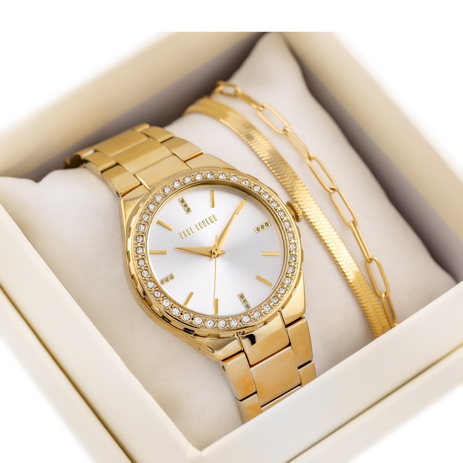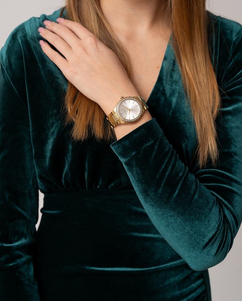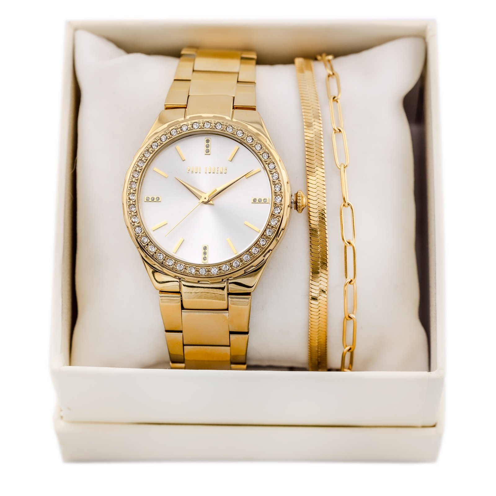 A women’s gift set that impresses with its elegance and timeless style. It includes a gold-colored stainless steel watch by Paul Lorens, with a beautiful silver-colored dial that subtly emphasizes its classic character. The watch’s golden envelope, decorated with sparkling cubic zirconias, adds a unique touch of glamour. The watch also features WR30 water resistance, which makes it practical and functional. The set comes with a double bracelet in gold, which perfectly matches the watch. It is an ideal choice for a gift – elegant, beautiful and unforgettable.