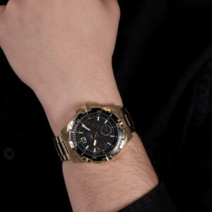 TIMEX Multifunction TW2T50800 men’s sports watch. Model with quartz mechanism. The envelope is made of stainless steel coated in gold color. The bracelet is made of stainless steel coated in gold. The black dial is protected by mineral glass. The diameter of the envelope is 45mm while the thickness is 12mm. The water resistance class of this model is 3ATM.