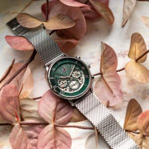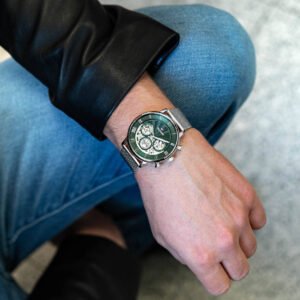 Zegarek męski TOMMY HILFIGER 1710567 Legend to nowoczesny i elegancki model do noszenia na co dzień. Koperta oraz bransoleta wykonana wysokiej klasy stali szlachetnej 316L, odpornej na korozję oraz hipoalergicznej w kolorze srebrnym. Na oryginalnej zielonej tarczy , ze szlifem słonecznym znajdują się subtarcze wskazujące: dzień miesiąca, dzień tygodnia oraz czas 24 godzinny. Całość chroniona szkłem mineralnym. Za odmierzanie czasu w zegarku Tommy Hilfiger 1710567 Legend odpowiada mechanizm kwarcowy, który można podglądać przez tarczę typu open-heart. Model 1710567 Legend posiada wodoszczelność na poziomie 5ATM co czyni go w niewielkim stopniu odpornym za wodę. Całość dopracowano w najdrobniejszym szczególe oraz zaprojektowano w zgodzie z aktualnymi trendami w modzie, otrzymując klasyczny, ale jakże elegancki zegarek.