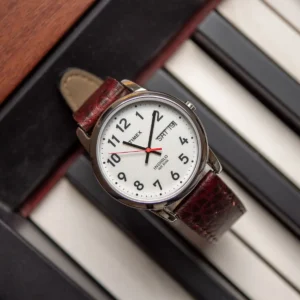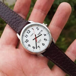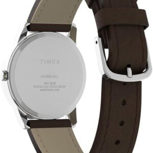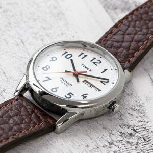Elegant men’s TIMEX EASY READER T20041 watch fits perfectly for everyday styling, as well as for more formal occasions. The white legible dial features a date display. This model has a brown leather strap and a silver envelope made of high-quality stainless steel. The water resistance class of the watch is WR30. INDIGLO dial backlight – A special patent for illuminating the dial. When you press the crown or the function button, the dial of the watch will be illuminated from underneath. UNISEX watch – due to the universal size the possibility of use by women and men.