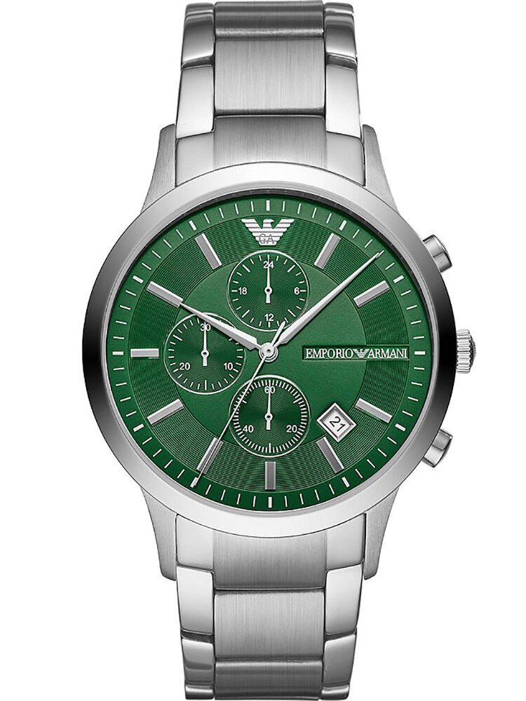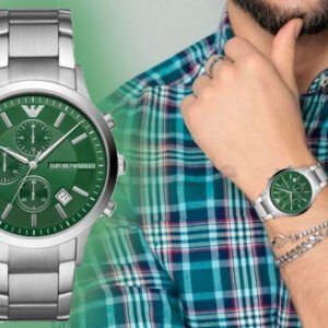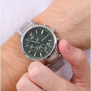 The Emporio Armani AR11507 watch is an unconventional men’s timepiece, ideal for both elegant attire and casual wear. The envelope is made of stainless steel with a high-quality silver-colored coating, which guarantees its long-lasting resistance to damage. The green-colored dial protected by mineral glass features a day of the month date, as well as chronograph and daylight saving time indications. The whole is complemented by a silver stainless steel bracelet.